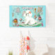 Sweet white poodle sitting among fancy cakes, a cupcake and desserts. Flourishes and birdies also in background. Background is aqua and colours are fun and bright. Great for a birthday party!