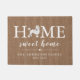 Personalised home sweet home door mat featuring a white poodle dog, with your family name & year established, set on a brown burlap look background