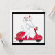 Cute white poodle on a Vespa style scooter. Very retro 50's with pretty poodle wearing a red necklace and riding the bright red scooter. Fun for parties for girls.