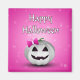 Happy Halloween illustration for girlies featuring a white pumpkin with a pink bow on a pink bokeh background.