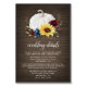 Wedding design features a rustic barn wood grain background with an elegant watercolor white pumpkin, gold printed fall leaf elements, burgundy red roses and a navy blue wildflower.