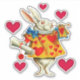 Custom-cut vinyl sticker with a vintage Alice in Wonderland image of the White Rabbit in full regalia on white surrounded by whimsical red hearts. See matching square sticker, favour bag, favour box, heart-shaped favour tag, gift bags, label and wrapping paper. See the entire Wonderland Sticker collection in the INVITES | Stickers & Labels section.
