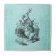 A vintage Alice in Wonderland art design with an antique white rabbit illustration on a teal ruled paper style background.