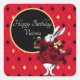 Festive birthday greeting features vintage illustration of the White Rabbit in red tinted Queen of Hearts garb with black and gold customisable text circle and red / gold / black diamond background