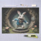 A dynamic tissue design for decoupage featuring the iconic White Rabbit from Alice in Wonderland. The rabbit is illustrated mid-action, energetically leaping out of a rabbit hole. His expression is one of urgency and excitement, with his watch in hand, highlighting the famous moment when he rushes to avoid being late. The design captures the motion of his jump, with swirling lines and a sense of movement, bringing the scene to life. The surrounding imagery includes a whimsical, colourful backdrop inspired by the magical world of Wonderland, filled with swirling patterns and fantastical elements. This vibrant tissue paper design would make a stunning addition to any decoupage project, embodying the spirit of adventure and curiosity from Lewis Carroll's beloved tale.