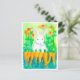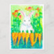 A pretty post card for Easter or any day to say hello featuring a white rabbit in a garden with bright orange carrots and wildflowers painted in colourful shades of watercolor.