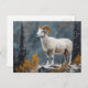 A white ram with magnificent horns standing on a snowy terrain surrounded by tall conifer trees and vibrant foliage, exuding strength and awe in a wild, wintry mountain setting.