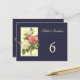 A custom Table Number postcard with script letters and pinkish red and white botanical roses on a dark blue faux linen background Click Customise It to change fonts, sizing and more, even save your design for later.