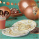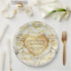 Lovely floral 50th Wedding Anniversary paper plates with a profusion of white roses. Overlay is an ornate golden heart. Gold text art says 50th Wedding Anniversary. Lower text area is ready to be customised by you.with names and date information