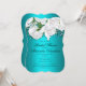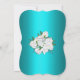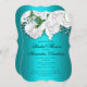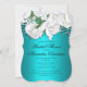 A gorgeous aqua and white floral bridal shower announcement, the design features a beautiful, traditional bridal bouquet of white roses and baby's breath at the top, over a very striking metallic aqua (or turquoise) base. The back of the invitation features the same lovely bunch of roses, in the centre of the card. This very elegant and sophisticated bridal shower invitation would be very suitable for an aqua-themed event or a party with a floral or botanical theme.