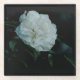 A photograph of a single white rose blossom among the darkness of the leaf foliage.