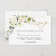 This design features an illustration of white roses with colourful vibrant foliage in watercolor style. Text "rsvp" is written in a Script.