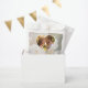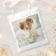 This elegant wedding favour bag design features a dreamy white rose photo by Destei faded into the background, with a heart-shaped photo template to showcase the couple. A beautiful "thank you" in flowing script sits above a personalizable text area for names, date or your own message. A romantic and personal touch for wedding guests to take home.