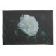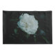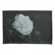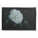 A photograph of a single white rose blossom among the darkness of the leaf foliage.