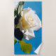 White rose under blue sky. Vibrant photo of a beautiful blooming rose makes a great floral wall art gift. The calm beauty of white rose reflects new beginnings, purity, loyalty and innocence. White roses symbolise the young love that the bride has for her spouse. White roses also symbolise the foundation of a relationship, which is why they are often seen on a wedding day. The white rose is a traditional wedding flower. White rose is a fitting flower for celebrating a new romantic and marital bond.