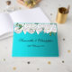 A stylish and very chic wedding guestbook in aqua, it features a beautiful bouquet of white roses and baby's breath along the top of the front, and a single, large white rose bouquet on the back. All details can be personalised to suit above. This beautiful guestbook is part of a larger matching collection, which you can have a look at here: https://www.zazzle.com/collections/white_rose_and_aqua_wedding-119374013320048670
