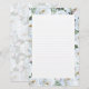 White roses border personal stationery with lines. The writing paper has a layered appearance with white roses and rosebuds and greenery around the edges. An off-white panel with light lines in the centre can be used to write a personal note. On the back a lighter rose background covers the paper. The paper has optional upgrades.
