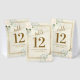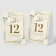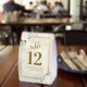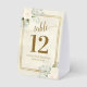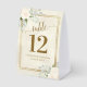 These beautiful table tent signs will make it easy for your guests to find their seats, and also make your wedding reception more beautiful. They feature an elegant boho chic design with a lacy script calligraphy title and the number in bold gold text making it easy to read. Below is space for the names of the couple and the wedding date. The corners are decorated with hand painted watercolor roses in shades of white and pale peach along with eucalyptus leaves and rustic greenery.
