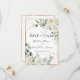 Gorgeous elegant white roses & tiny daisies surrounded with a rustic gold frame & mixed greenery of eucalyptus with other watercolor leaves wedding invitation. Clean white background adds to the elegance of this lovely design. Stunning. Faux gold splashes on front & back to create a chic look.