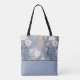 This beautiful white roses on a blue background oil painting style artwork is perfect for an all-over print tote bag. The bottom third (aprox.) is a coordinating solid with a thin stripe. Tote bags are a fun seasonal aesthetic accessory. AI assisted graphic purchased with commercial license. Artwork: DigitalCurio