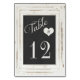 This is a wedding table number card that features a chalkboard look background surrounded by a distressed white frame. Perfect for a vintage or rustic themed wedding.