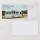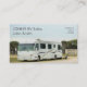 Large white RV coach with empty car dolly. This RV business card could be used by RV campgrounds, sales or repair shops.