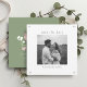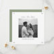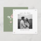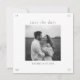 This chic white and sage green wedding save the date card features a striking couple photo at the front, typographical text and contemporary font. A lovely blush pink floral illustration is included at the back with additional text.