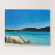 This quite difficult puzzle features the clear blue water of the emerald sea in Corse (France) with all shades of turquoise, surrounded by green Mediterranean scrub and a marvelous white sand beach with scenic rocks, on a sunny summer day with a clear blue sky.