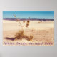 The image captures a desert landscape with white sand dunes under a clear blue sky. In the foreground, clumps of dry yucca with seed pods add texture to the sandy terrain. The dunes stretch into the distance, creating a sense of vastness. A range of mountains is visible on the horizon, adding depth to the scene.