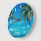 A clock with a tropical themed photo featuring coconut palms stretching out across a white sandy beach. Turquoise waters and an azure blue sky in the background.