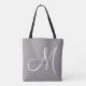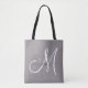 Personalised black and white monogrammed stylish tote bag with a script font design on a printed faux grey linen photo effect background. Trendy typographic style.