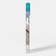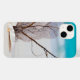 A phone case with a gorgeous photograph. Tropical blue water and foamy surf in the background. A collection of seashells and stems set on a white sandy beach.