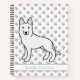 Destei's original cartoon illustration of a cute White Shepherd / White Swiss Shepherd / white coat colour German Shepherd breed dog. There is also a personalizable text area for the title of the notebook. The background has a pattern of grey dog paw prints.