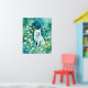 A poster of an adorable dog standing in a fantastical landscape with white flowers blooming in abundance. The pale colours like watercolors add a gentle atmosphere to your room.