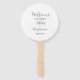 Wedding day ceremony program on a round style hand fan that features a white background with the bride and groom names and date on front side of fan, along with dark grey, stylised script listing the wedding party participants and ceremony rites on back side of fan. Edit hand fan and replace names and info with your own wedding program info. Perfect for a summer, outdoor wedding venue! Select number of hand fans desired.