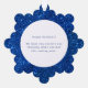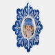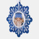 Magical lacy white snowflake with round photo template and white border with customisable text on a sparkly faux blue glitter background. Back features matching background with blank round element and editable text field.