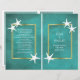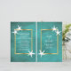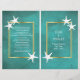 White starfish on teal stained grunge paper modern folded booklet style beach wedding ceremony and party program featuring a gold frame on dark aqua teal blue background and white starfish on the corners. This elegant summer wedding design is part of a wedding set or collection and is a totally customisable template perfect for a beach destination summer wedding. You will have to fold in the centre to have a folded program. Choose only the value paper type as it folds well.