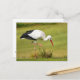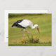 Closeup white stork (Ciconia ciconia) standing on grass, a raised leg, looking for food near of pond