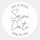 Decorate your wedding Save the Date invitation envelopes with these white, round stickers with black, stylised script. Personalise your stickers by replacing bride and groom names and wedding date with your own. Select from matte or glossy style.