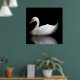 White mute swan floating in a lake with reflection in the water against black background. Low key.