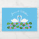 This awesome sheet of Wedding mini sparkling wine bottle labels features a digital art image of a pair of beautiful white swans with orange becks facing each other looking like they are kissing. Underneath the swans is a group of pretty pink water lily flowers with yellow centres and green lily pads. A beautiful wedding design. There is custom text so you can include the names of the happy couple.