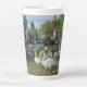 Painting of white swans resting and eating in special area near Begijnhof in Bruges, Belgium. Digital generated painting. Area designated for swans in the historic city center in Bruges old town