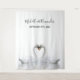 Two beautiful swans in love bending their heads toghether and forming a heart. White elegant background. Template for the bride and groom's names and the wedding date. Black letters. A swan couple stay together for life, so they are the perfect symbol of love. Can be used as a welcome banner or a photo backdrop.