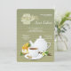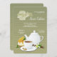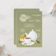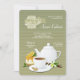 A tea party invitation featuring a white teapot, cup and saucer, next to an orange topped cheese cake. (<a href='https://www.freepik.com/free-vector/tea-party-poster_1530872.htm'>Designed by Freepik</a>). <br/><br/>The card is easy to customise with your wording, font, font colour and choice of six paper types.<br/><br/>Not exactly what you're looking for? All our products can be custom designed to meet your needs at no extra charge.<br/><br/>Simply contact us at askcottonlamb@gmail.com<br/><br/>Coordinating products available: