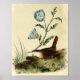 Vintage painting of a white throated wrenl with beautiful blue flowers. Illustrated in the Victorian Era, 1862 by artist and American ornithologist John Cassin.