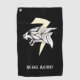 This golf towel for him features a roaring tiger head tribal in white with a yellow thunderbolt on a black background.