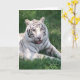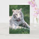 A white tiger with blue eyes against nice green grass sits in this vertical tiger portrait photograph. Great for any tiger lovers!