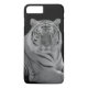 Custom iPhone 7 Plus case, with a close up photograph of a white tiger against a black background. Black text, at the bottom, is ready to personalise for yourself or as a cool gift idea to your favourite tiger or wild life fan.