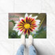 This custom doormat features a close-up image of a white-tipped Gazania flower. "Welcome" is added in easy-to-read lettering in a shade of green that matches the image. The mat measures 24" x 36" and has a smooth felt front and nonslip latex back. It also has a reinforced edge to resist fraying. The mat is both fade and mildew resistant, and it cleans easily with a spray of water. Ideal for covered entryways such as porches, offices, condos, etc. Feel free to contact me through Zazzle if you have questions about this mat or would like help transferring this design to a different item. I'm happy to help to ensure the image & wording fit correctly.