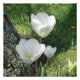 Tulips are a perennial plant in the genus Tulipa, and belongs to the family Liliaceae. The tulip blooms year after year, with showy spring flowers in your garden landscape. Three white tulip blossoms stand tall on long green stems as the white petals dominate the foreground. A bluish green lichen clings to the bark of a pine tree. The tree casts a shadow across the lawn. Variegated Tulip leaves are outlined with a pastel or light green.